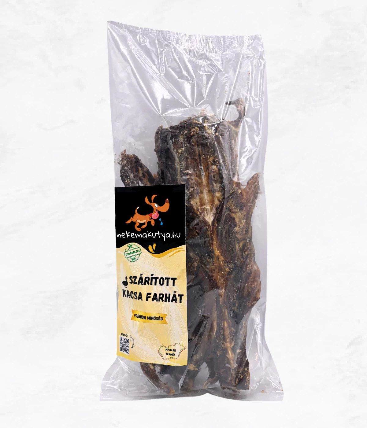 A nekemakutya szárított kacsafarhát prémium minőségű, húsos csemege, mely egy zsigerelt, zsiradéktól, bőrtől és végtagoktól megtisztított, egészben szárított récetest. Ideális nagyobb testű kutyusok számára.