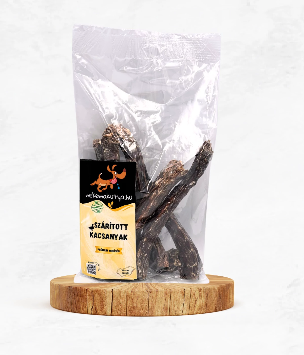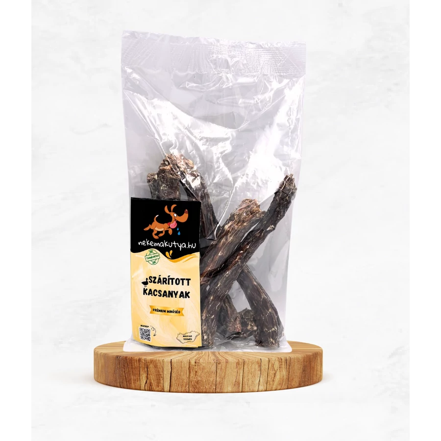 A szárított kacsanyak a vízi szárnyasból származó, ízletes, csontos vörös hús. Ezen csemege hipoallergén, vöröshúsú szárnyas alapanyagból készül. Gondos kézi munkával eltávolítjuk a zsírokat, majd kíméletes szárítással tartósítjuk. A benne található fehérje magas minőségű, és könnyen emészthető. Vitaminokban és ásványi anyagokban gazdag úgy, mint a vas és a cink, amelyek fontos szerepet játszanak kutyád immunrendszerének és emésztésének egészségében. Adalékanyagot, színezéket nem tartalmaz.
