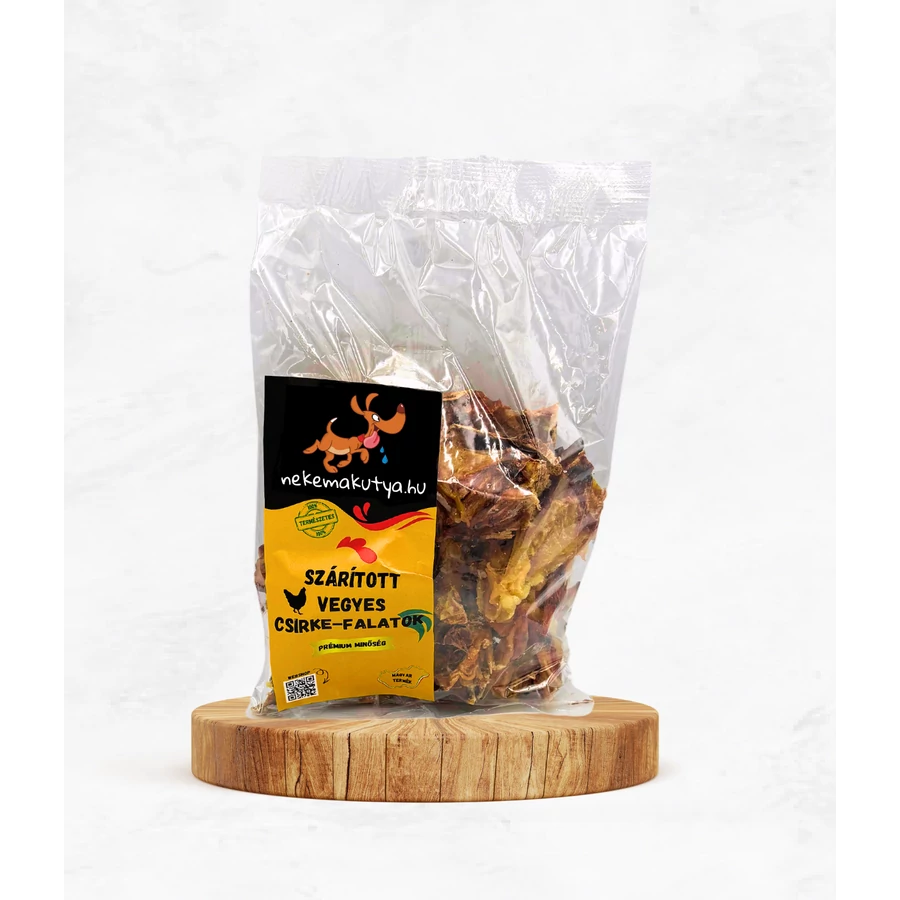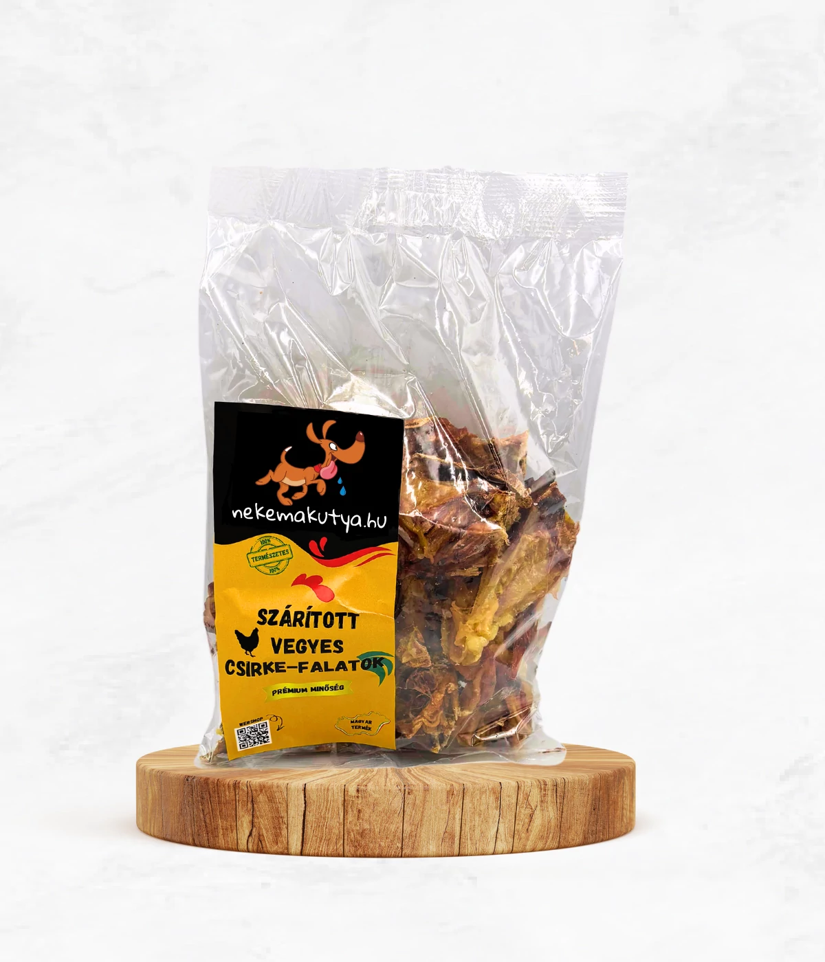A nekemakutya szárított csirke vegyes-falatokat úgy válogattuk össze, hogy a ropogós csontos részek mellett húsos falatokkal még nagyobb örömet szerezzünk a kutyáitok számára. Termékünk húsos csirkemellcsontot, csirkeszárnyvéget, valamint apróra vágott csirkefarhátat tartalmaz, igazán különleges prémium jutalomfalat.